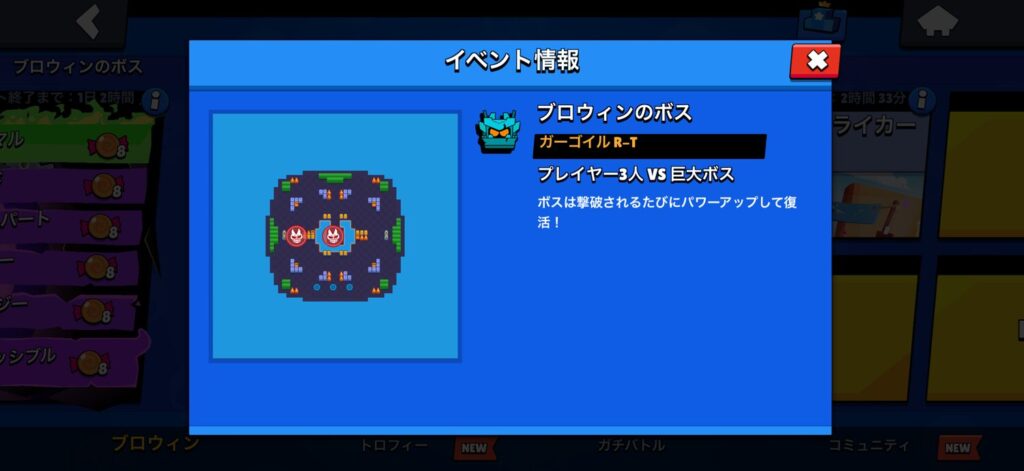 今回のイベントは、ブロウィンの仮装をしたボスを制限時間内にチームメイト3人で倒しきるという内容です。