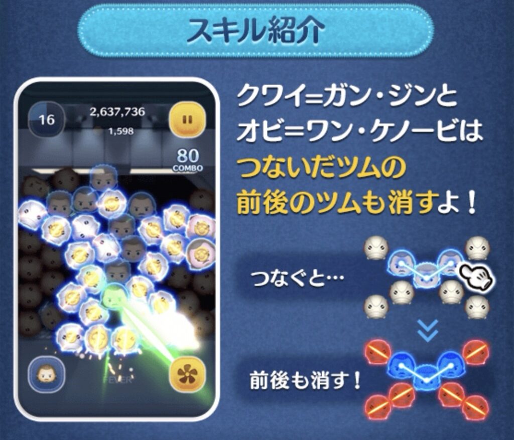 | スキル | 一緒に消せるオビ=ワンがでて、少しの間つなぐと前後のツムも消すよ! |