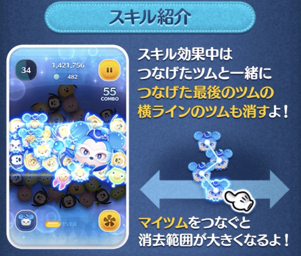 | スキル | つなげたツムと一緒に横ライン状のツムも消すよ! |