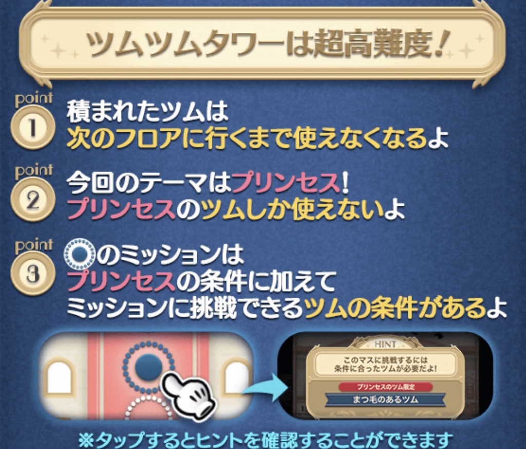 前回であれば「ミッキー&フレンズかつ鼻が黒いツム」といった指定がありました。今回も「プリンセスかつ冠をつけているツム」のような二重指定が予想されます。