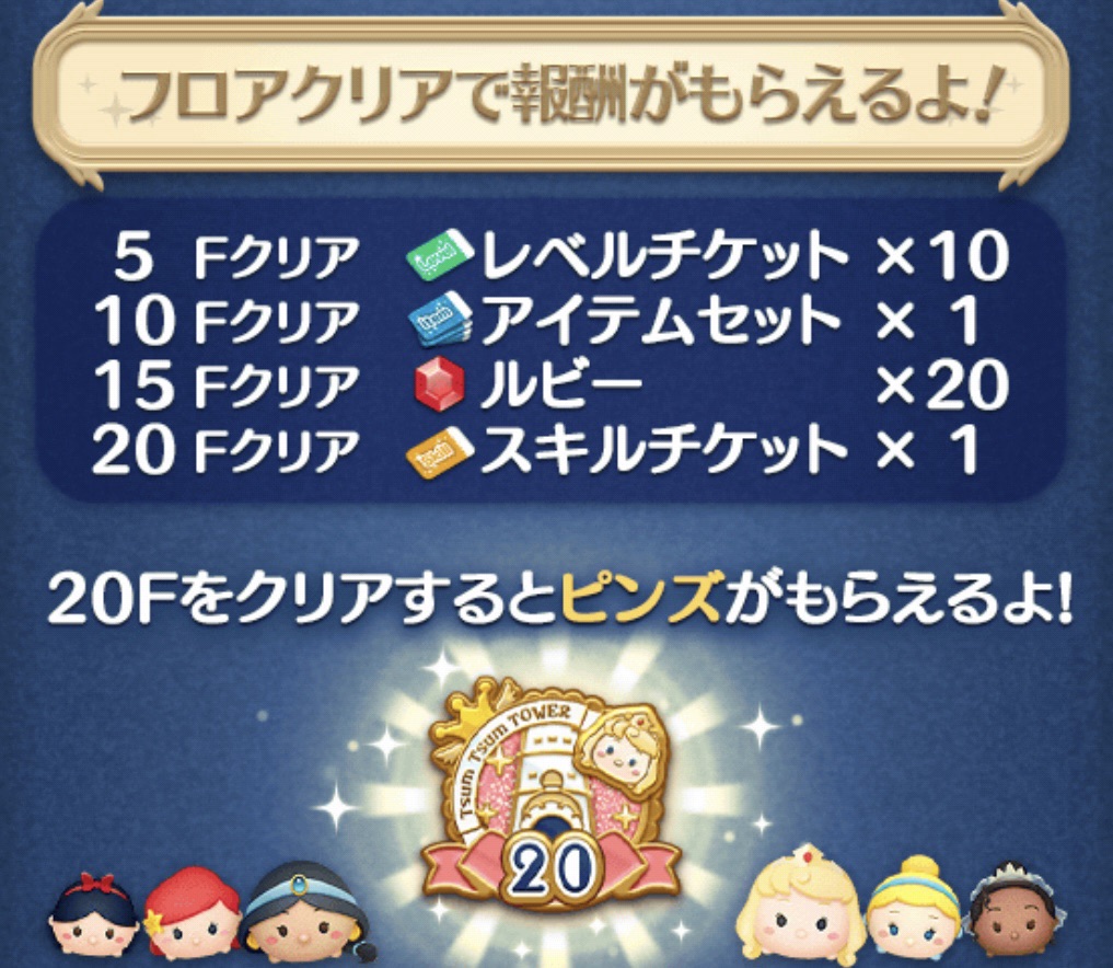 ツムツムタワーは全100階まで用意されていますが、まず目標とすべきは20階到達です。